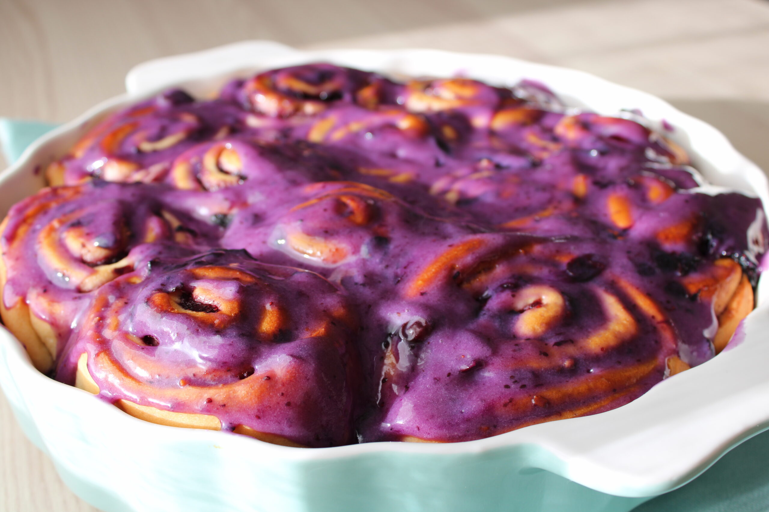 After a short second rise, the rolls are baked until lightly golden and perfectly soft. While still slightly warm, they are topped with a smooth blueberry cream cheese frosting that melts gently over each roll, adding a creamy and slightly tangy finish.