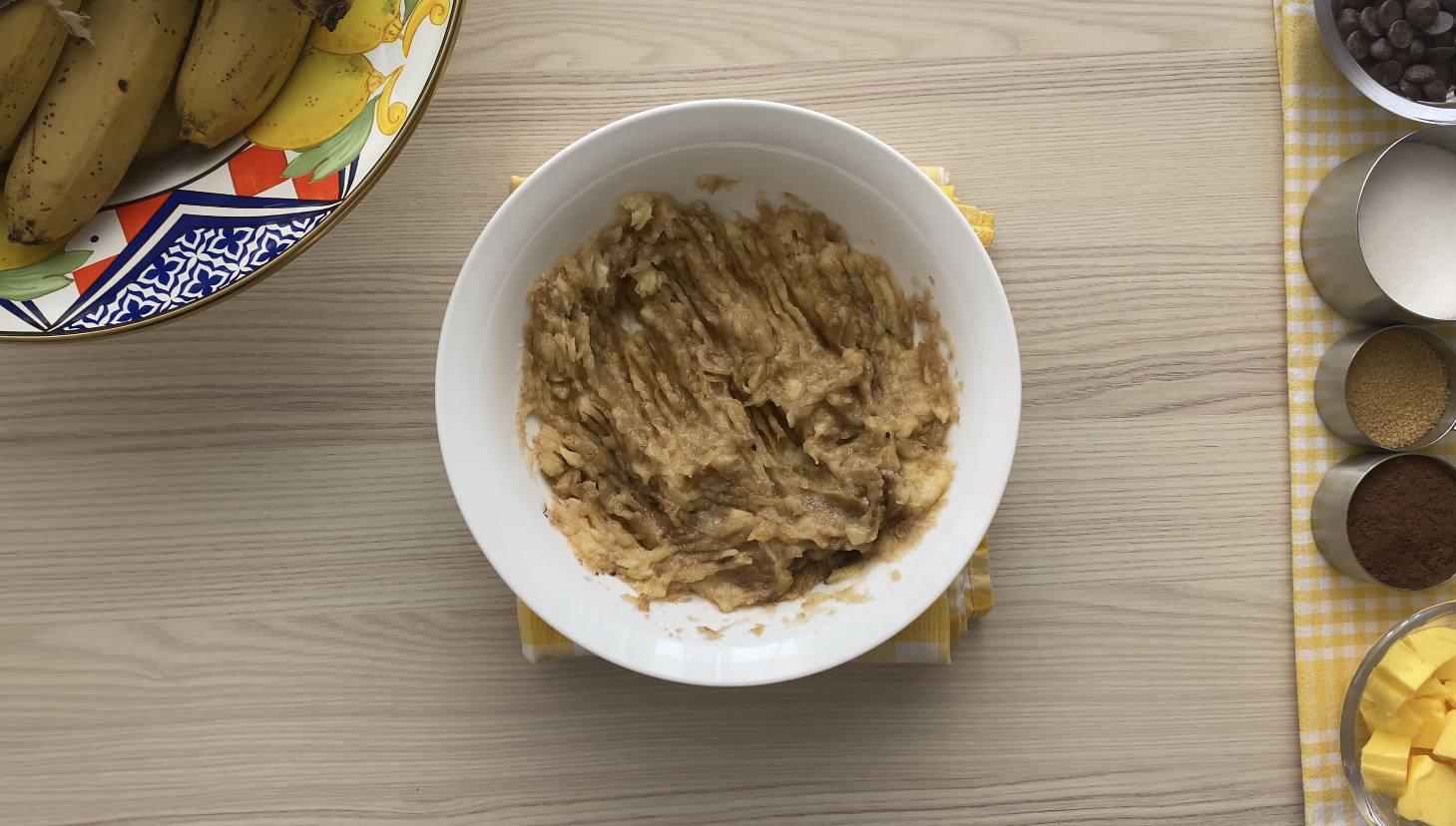 Mash the ripe bananas in a bowl until mostly smooth, leaving a few small pieces for texture.