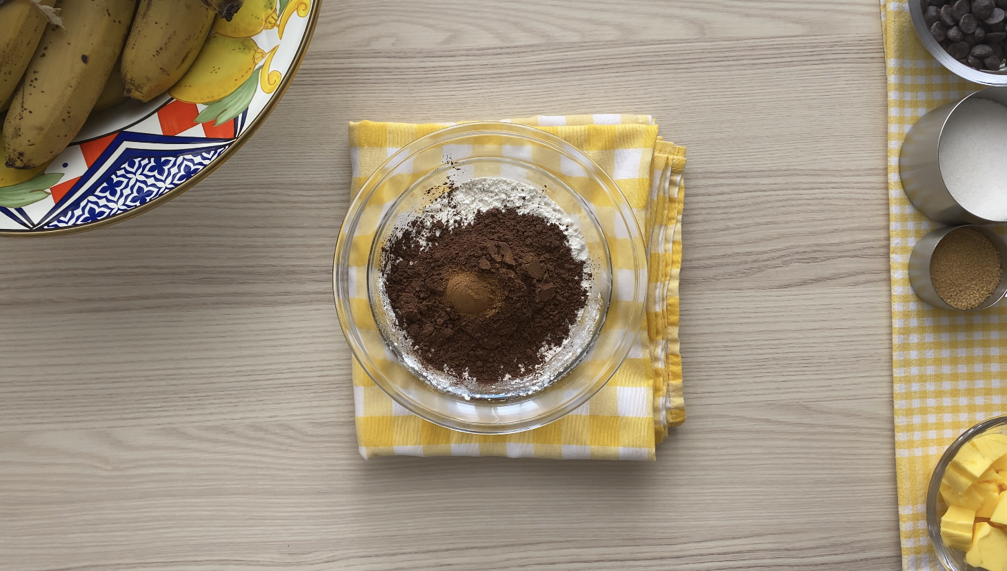 • Whisk dry ingredients: flour, cocoa powder, baking soda, salt, and cinnamon.