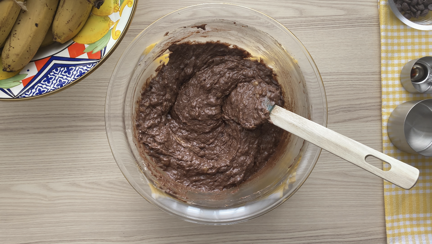 Fold in the chocolate chips and transfer the batter into the prepared loaf pan, smoothing the top.
