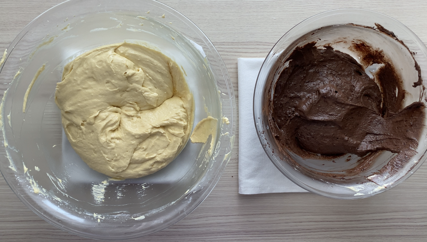 Divide the batter evenly between two bowls. Leave one portion plain and sift cocoa powder into the other portion. Add a tablespoon of milk to the chocolate batter and mix until smooth.