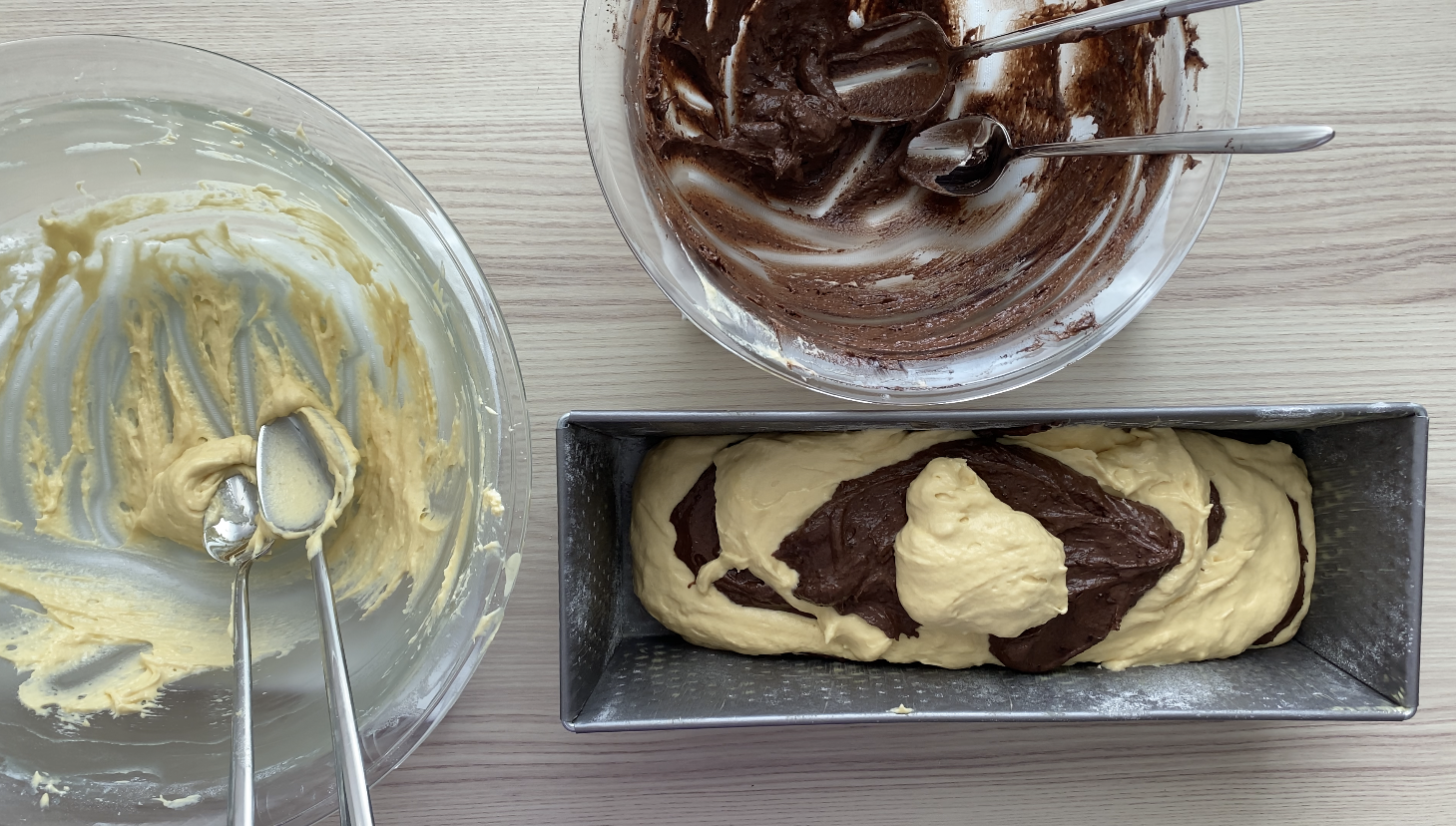 Spoon alternating layers of vanilla and chocolate batter into the prepared loaf pan. As the layers build, the batters naturally create the marble pattern. Once all the batter is in the pan, gently tap it on the counter so the mixture settles evenly.